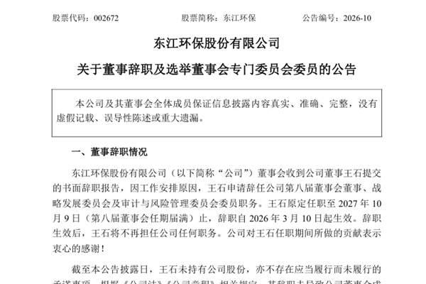 东江环保股份有限公司(简称:东江环保)公告称,董事会近日收到公司董事王石提交的书面辞职报告,因工作安排原因,王石申请辞任公司第八届董事会董事、战略发展委员会及审计与风险管理委员会委员职务。王石原定任职至2027年10月9日(第八届董事会任期届满)止,辞职自2026年3月10日起生效。辞职生效后,王石将不再担任公司任何职务。 3月10...