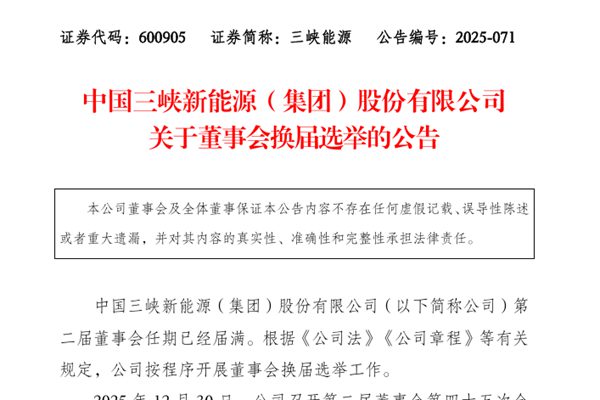中国三峡新能源(集团)股份有限公司(简称:三峡能源)公告称,公司第二届董事会任期已经届满。根据《公司法》《公司章程》等有关规定,公司按程序开展董事会换届选举工作。12月30日,三峡能源召开第二届董事会第四十五次会议,审议通过《关于公司第二届董事会换届的议案》,上述议案尚需提交公司2026年第一次临时股东会审议。 一、董事会换届选举情...