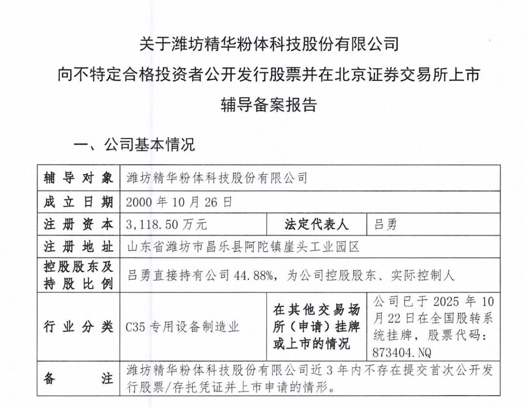 证监会显示,2月3日,潍坊精华粉体科技股份有限公司(以下简称:潍坊精华)在山东证监局完成IPO辅导备案,拟北交所上市,辅导机构为财达证券股份有限公司。图片来源于证监会 值得一提的是,潍坊精华于2025年10月刚刚挂牌新三板。从外界释出的消息来看,潍坊精华的资本市场进击之路也并未止步于新三板,公司董事长吕勇曾明确表示:“力...
