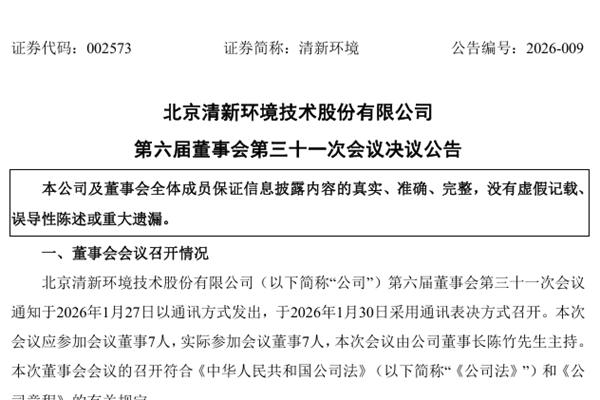近日,北京清新环境技术股份有限公司(简称:清新环境)召开第六届董事会第三十一次会议,审议通过了《关于2026年度日常关联交易预计的议案》、《关于以非公开协议方式转让四川天府岷源环境科技有限公司100%股权的议案》。 据悉,清新环境董事会同意公司以非公开协议方式转让四川天府岷源环境科技有限公司100%股权,鉴于受让方为公司全资子公司四...