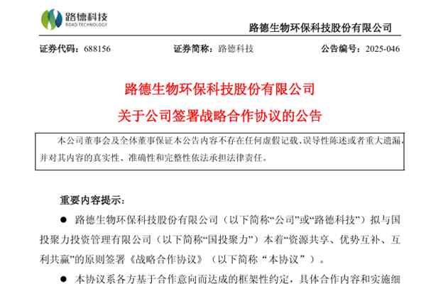路德生物环保科技股份有限公司(简称:路德科技)近日公告称,公司拟与国投聚力投资管理有限公司(下称“国投聚力”)本着“资源共享、优势互补、互利共赢”的原则签署《战略合作协议》。 据介绍,国投聚力成立于2017年9月28日,注册资本10000万元人民币,经营范围涉及投资管理,资产管理(依法...