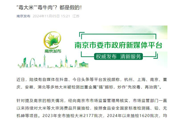 南京发布、互联网联合辟谣平台等均已公开通告,近日某些自媒体号发布的所谓【杭州、上海、南京、重庆、安徽、湖北等多地大米被检测出重金属“镉”超标,炒作“先投毒,再治病”】的视频均系谣言,请大家勿信谣勿传谣! 据了解,南京市场监管部门一直以来持续对大米等大宗消费品开展抽检,按照食品安全国家标...