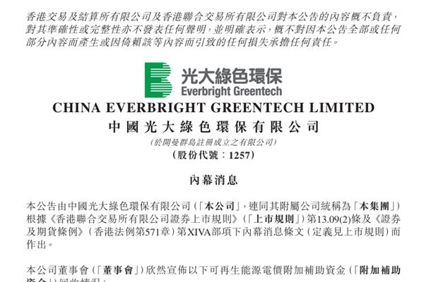 近日,中国光大绿色环保有限公司(简称:中国光大绿色环保)发布一则《内幕消息》,公开可再生能源电价附加补助资金(“附加补助资金”)回收情况: 一、 回收补助资金的基本情况:自2025年7月1日至2025年8月31日,集团下属33间公司,涉及生物质综合利用、光伏发电及风电项目,已收到国家电网公司关于附加补助资金结...