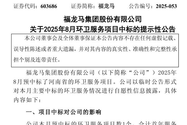 福龙马集团股份有限公司(简称:福龙马)近日发布《关于2025年8月环卫服务项目中标的提示性公告》: 福龙马8月预中标的环卫服务项目数1个,合计首年服务费金额为2,530.70万元(占公司2024年度经审计营业收入的0.50%),合同总金额为7,592.11万元。截至本公告披露日,福龙马本年度环卫服务项目中标数27个,合计首年年度金额...
