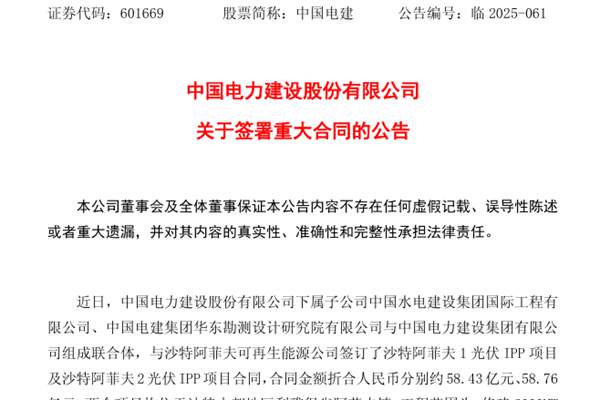 中国电力建设股份有限公司(简称:中国电建)近日公告称,下属子公司中国水电建设集团国际工程有限公司、中国电建集团华东勘测设计研究院有限公司与中国电力建设集团有限公司组成联合体,与沙特阿菲夫可再生能源公司签订了沙特阿菲夫1光伏IPP项目及沙特阿菲夫2光伏IPP项目合同,合同金额折合人民币分别约58.43亿元、58.76亿元,共117.19...