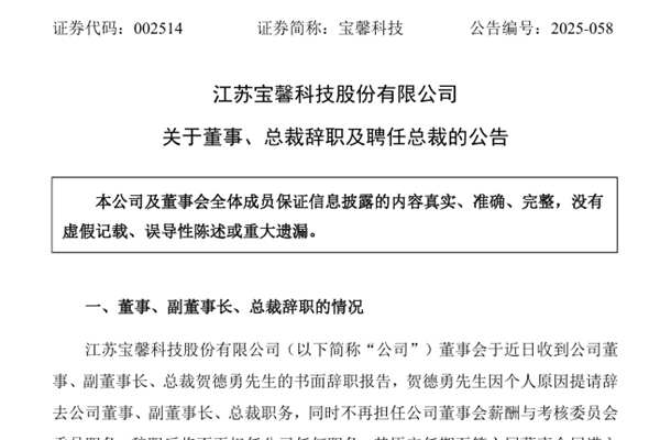 6月3日,江苏宝馨科技股份有限公司(简称:宝馨科技)发布公告称,公司董事、副董事长、总裁贺德勇因个人原因辞去所有职务,辞职后不再担任公司任何职务。同日,宝馨科技董事会审议通过了《关于聘任公司总裁的议案》,正式任命马琳女士为公司新任总裁,任期至第六届董事会届满。图源:宝馨科技公告 据悉,马琳出生于1977年,与宝馨科技实际控制人马伟系...