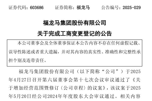 福龙马集团股份有限公司(简称:福龙马)近日公告称,公司已取得龙岩市市场监督管理局换发的《营业执照》,《营业执照》信息中除了公司经营范围新增“机动车修理和维护”外,其他信息不变。图源:福龙马公告 申明:本站发布此信息的目的在于传播更多信息,与本站立场无关。并且郑重提示所有阅读者,股市有风险,投资需谨慎,本文不作...
