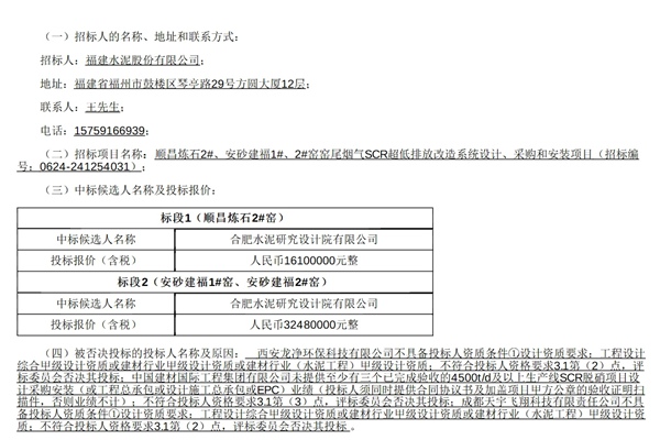 顺昌炼石2#、安砂建福1#、2#窑窑尾烟气SCR超低排放改造系统设计、采购和安装项目中标候选人公示,标段一合肥水泥研究设计院有限公司,投标报价人民币16100000元整;标段二合肥水泥研究设计院有限公司,投标报价人民币32480000元整。 该项目包括拟实施改造的生产线为顺昌炼石2#窑、安砂建福1#窑和2#窑三条生产线,高温高尘SC...