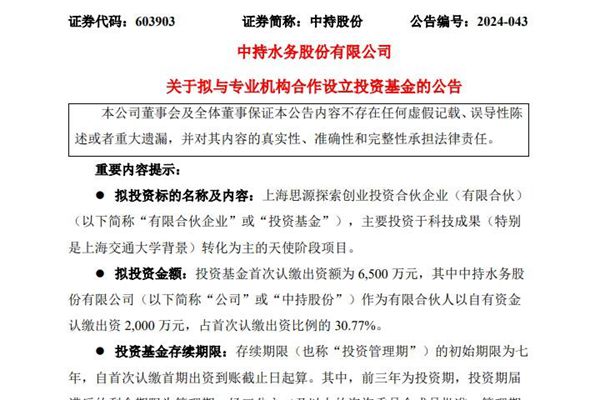 中持水务股份有限公司(简称:中持股份)公告称,公司将与专业投资机构启高投资管理(上海)有限公司、云涌产业共赢(北京)创业投资有限公司、南通市交大未来产业投资基金中心(有限合伙)及其他企业及个人共同投资设立投资基金——上海思源探索创业投资合伙企业(有限合伙)(下称“投资基金”),主要投资于...