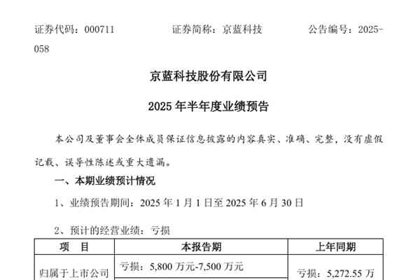 京蓝科技股份有限公司(简称:京蓝科技)近日发布《2025年半年度业绩预告》。报告期内,京蓝科技预计实现归属于上市公司股东的净利润亏损5,800万元-7,500万元,亏损较上年同期增加10.00%-42.25%;扣除非经常性损益后的净利润亏损6,000万元-7,700万元,亏损较上年同期增加17.32%-50.56%。图源:京蓝科技公告...