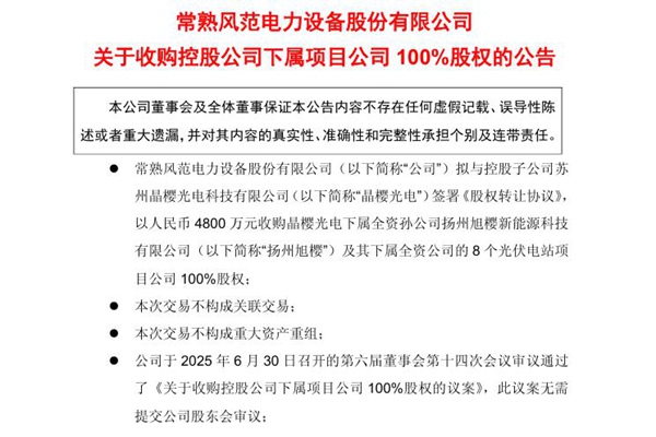 2025年07月02日, 常熟风范电力设备股份有限公司发布《关于收购控股公司下属项目公司 100%股权的公告》。图源:风范股份公告 公司拟与控股子公司苏州晶樱光电科技有限公司签署《股权转让协议》,以自有资金人民币4800万元收购晶樱光电下属全资孙公司扬州旭樱新能源科技有限公司及其下属全资公司的8个光伏电站项目公司100%股权。 这...
