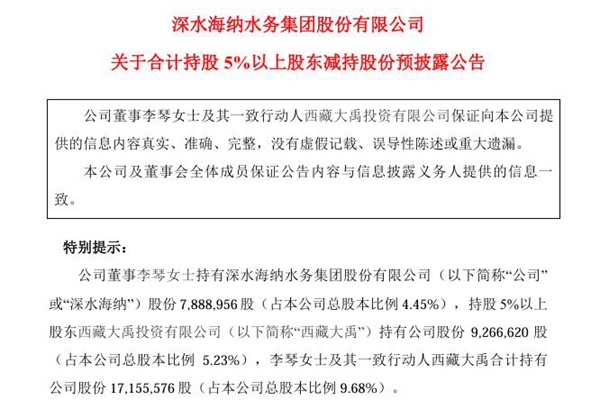 2025年07月04日,深水海纳水务集团股份有限公司发布《关于合计持股 5%以上股东减持股份预披露公告》。图源:深水海纳公告 公司董事李琴女士及其一致行动人西藏大禹投资有限公司计划在自本公告披露之日起十五个交易日后的三个月内以集中竞价交易方式或以大宗交易方式减持本公司股份合计不超过3,545,600股(占公司总股本比例2%)。 减...