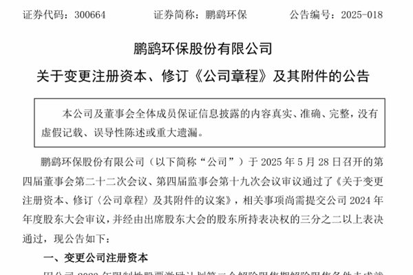 鹏鹞环保股份有限公司(简称:鹏鹞环保)近日公告称,因公司2023年限制性股票激励计划第二个解除限售期解除限售条件未成就、激励对象离职、离世等原因,公司将回购注销相关人员持有的355.6万股限制性股票。前述股票注销完成后,公司股份总数由 75,981.2332 万股变更为75,625.6332万股,公司注册资本由人民币75,981.23...
