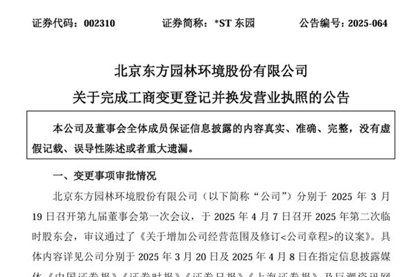 北京东方园林环境股份有限公司(简称:*ST东园)近日公告称,公司已完成了工商变更登记手续,并取得了北京市朝阳区市场监督管理局换发的《营业执照》。据悉,*ST东园经营范围新增技术推广;新兴能源技术研发;风力发电技术服务;风电场相关系统研发;太阳能发电技术服务;光伏设备及元器件销售;储能技术服务;节能管理服务;合同能源管理;发电业务、输电...