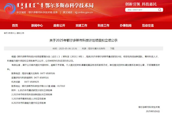 近日,鄂尔多斯市2025年科技计划项目进行了公示,由鄂尔多斯市生态环境局组织申报的“黄河流域鄂尔多斯段微纳米塑料的行为特征及生态风险综合评价”科研项目获批立项。本项目由鄂尔多斯市固体废物与土壤生态环境技术中心牵头负责,该中心目前共承担三项市级生态环境科技研发项目,为生态环境系统科研能力建设起到了重要的示范引领作...
