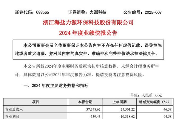 浙江海盐力源环保科技股份有限公司(简称:力源科技)近日发布《2024年度业绩快报公告》。快报显示,力源科技2024年实现营业总收入3.74亿元,同比上涨46.58%;归属于母公司股东的净利润257.45万元,上年同期亏损8784.25万元;扣除非经常性损益后归母净利润为-2760.1万元;基本每股收益为0.02元;归属于母公司股东的每...